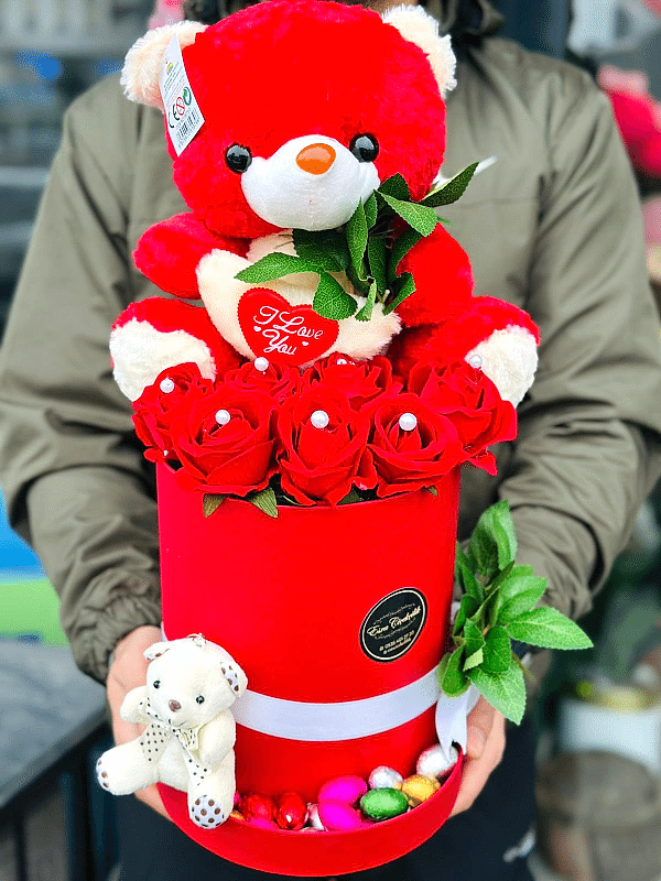 kırmızı peluş ayı ve yapay kırmızı güller &draje çikolata tasarımı