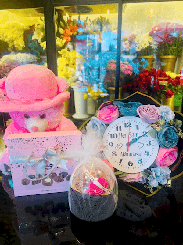 Pembe Peluş Ayı &Saatli Yapay Buket & Bolçi Çikolata Kutusu & Fanusta Şoklanmış Gül ve Mini Ayı Kutusu